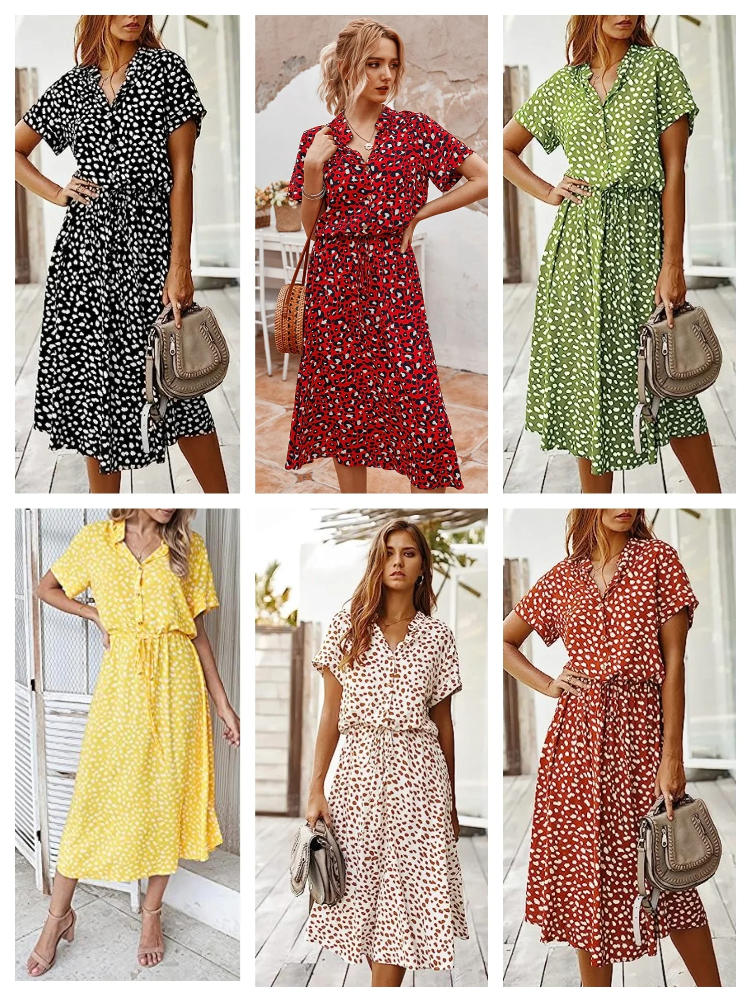 • [STYLISH DESIGN]-Summer midi dress for women design with classic button down henley closure to show your charming neckline,casual rolled short sleeve,adjustable tie front waist is more custom fit upon your need,gorgeous high waist line will visually prolong your length,elegant midi length,vintage polka dot print,relaxed a line swing flowy design,eyes catching bohemian style make this dress be your must-have in summer fashion.