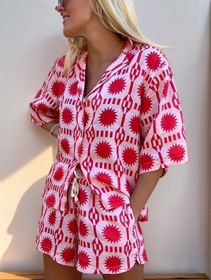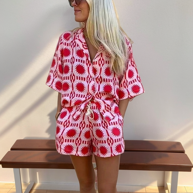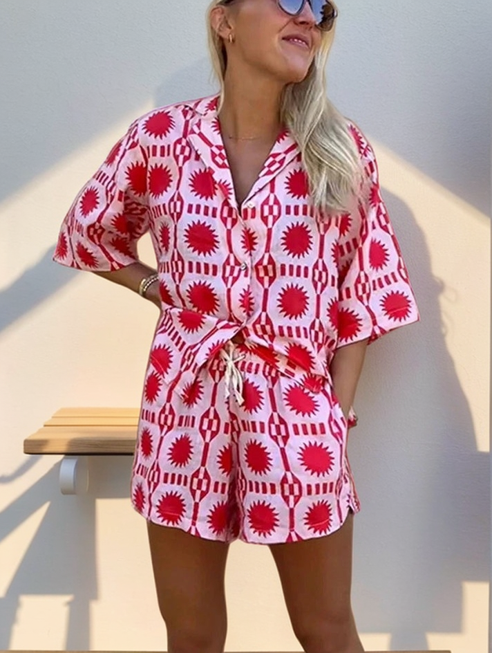 🌸 Floral Elegance – The playful floral print on the shirt adds a touch of summer sophistication.